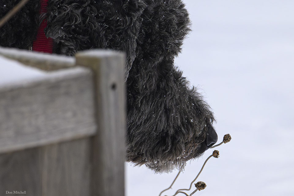 Tommy's searching for something interesting to smell. Last summer's daisies aren't what he had in mind.
