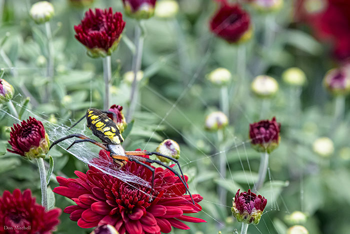 Ms Spider must have stayed out late Saturday night and gotten hammered. A pot of chrysanthemums is not a good place to spin a web.