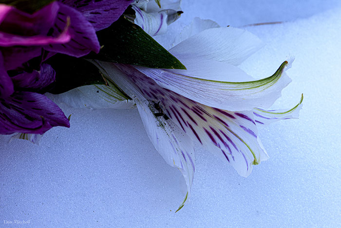 Wilting indoors flowers in the snowbank.