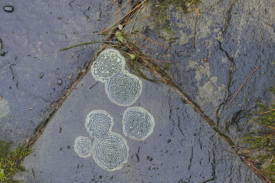 Lichen on the front walk, in a cold rain.