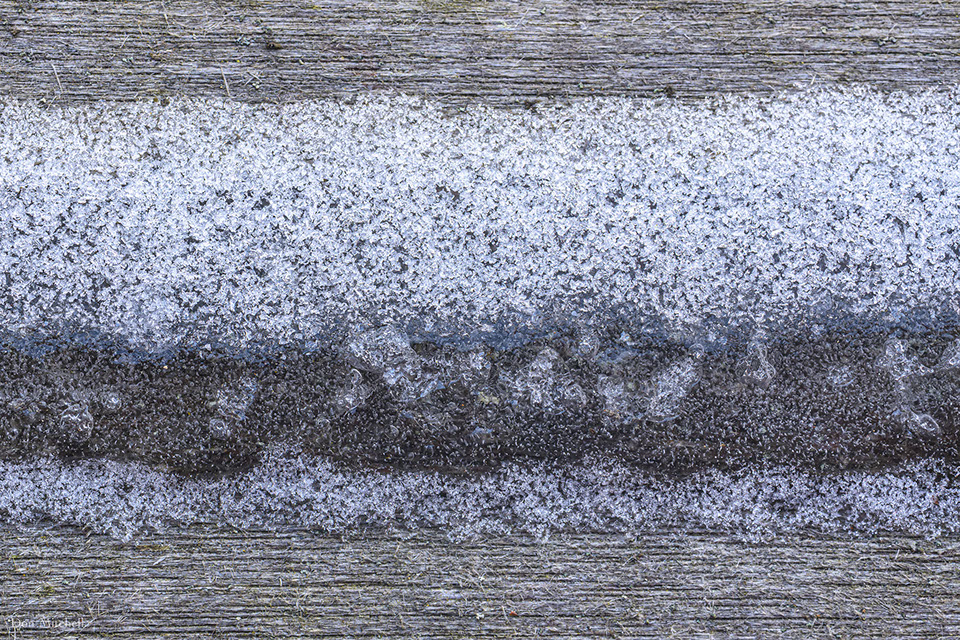 Ice and lichen on the porch railing. Next summer I'll refinish them.