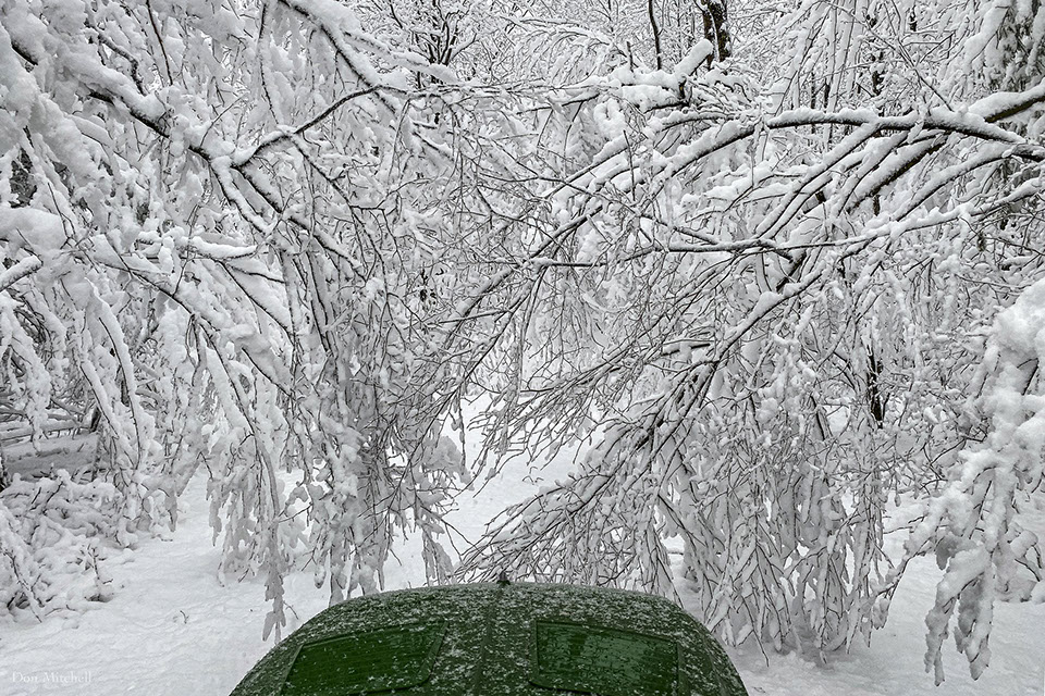 Big storm, long power outage, so this is very, very late. Tractor faces off with bend snow-laden trees.