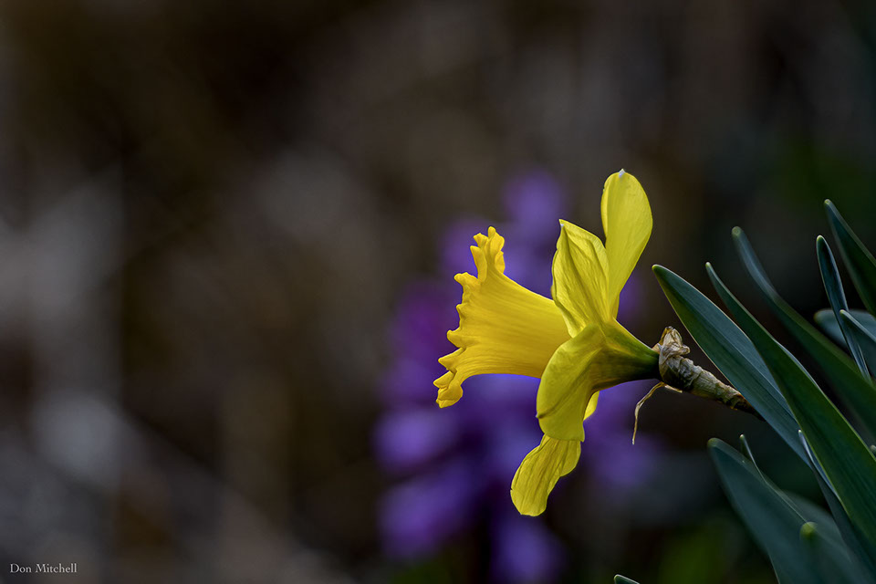 Daffodil with hyacinth background.