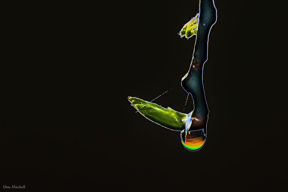 A drop of water on one of the willow branches, though which the (modified) sky and a pine tree can be seen.