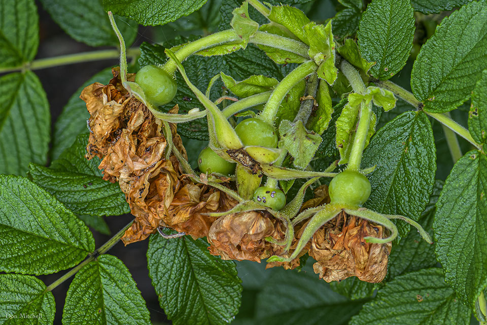 What remains of some rugosa blossoms.