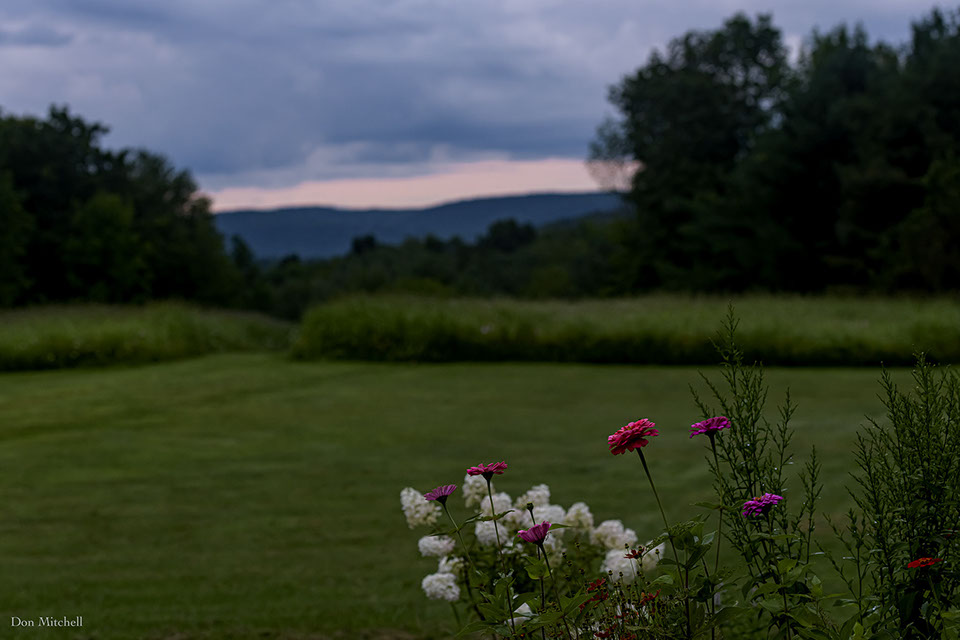 I had to get rolling early, so here are early-morning zinnias, hyacinths, and sky.