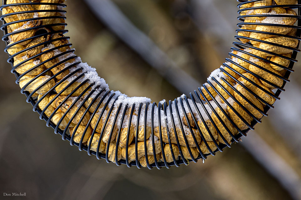 Bluejay peanut feeder, with snow.