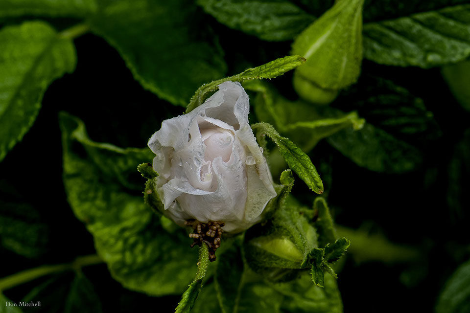 White rose on 'Ohia's rugosa. In the rain.
