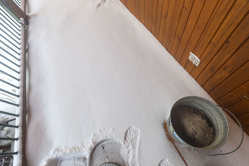 Front porch ash bucket, with snow. (Ashes are better than salt, for ice, and much greener.)
