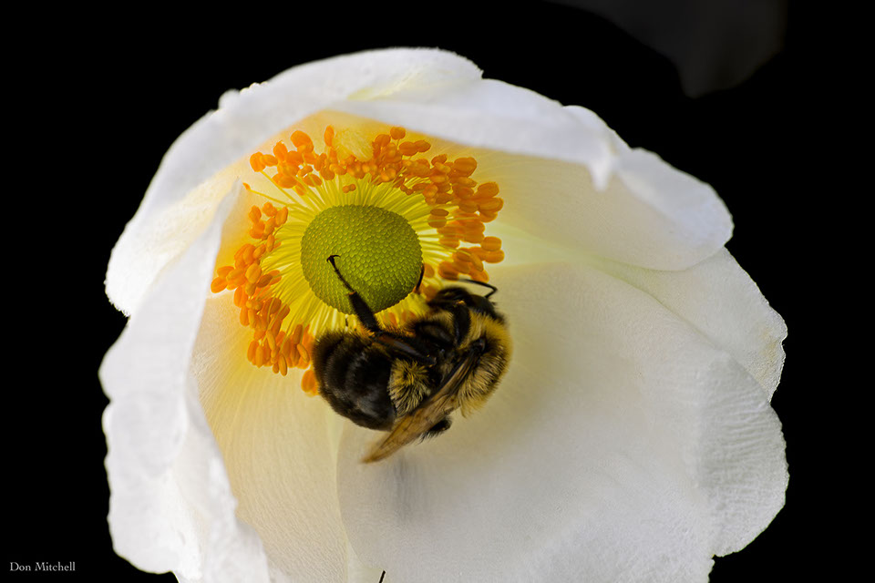 I was shooting into one of the Japanese anemones when a bee flew in and got busy.