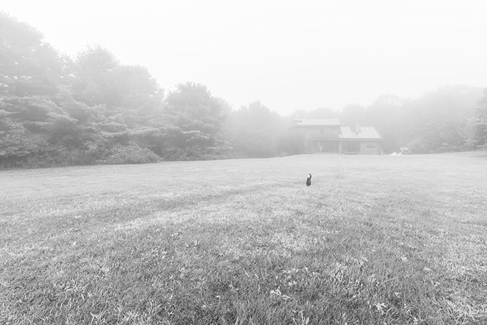 Foggy morning. 'Ōhi'a the cat came out to help me. The shot of her heading back to the house was better than the ones I'd made earlier.