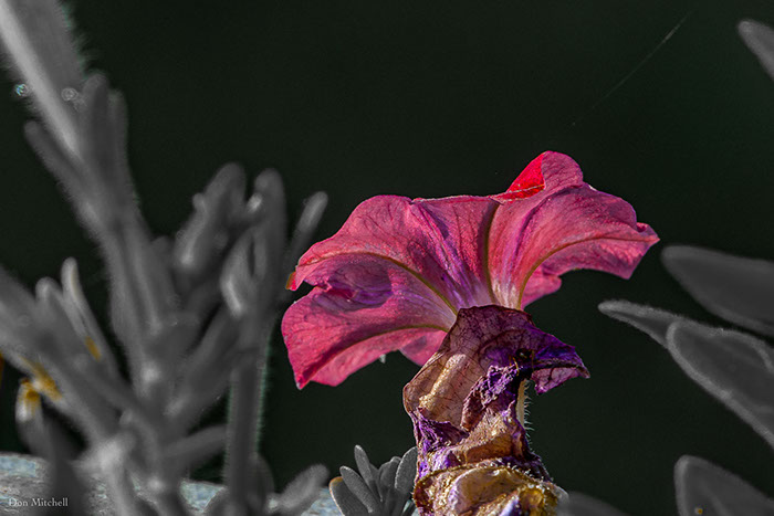 Day 5 of the Petunia Project. This shot is at about 90 degrees relative to yesterday's. There's still some purple, but it's fading fast. Two more days. Did I remove the greens. Yes.