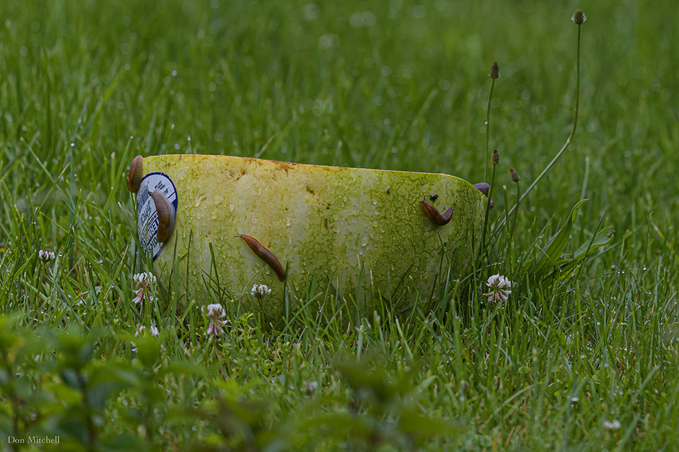 Rainy, dull, foggy morning, so I shot the watermelon rind I put out to see what might eat it.
