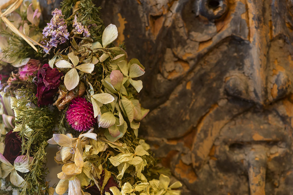 The lei Ruth wore at our wedding, with a Sepik food hook in the background.
