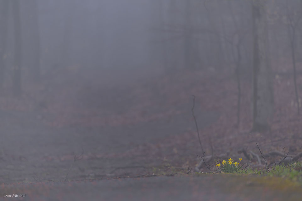 Fog, woods, daffodils.