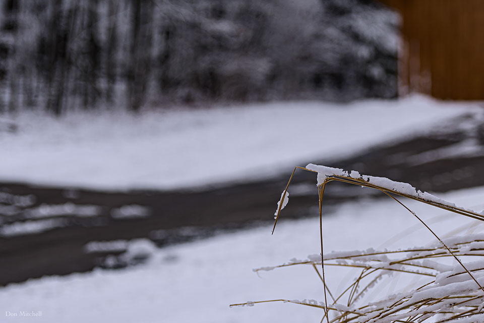 Grass, driveway, barn. Snow.