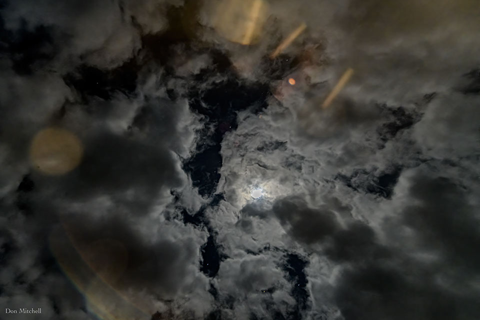 Moon, clouds, and some artifacts from the porch light.