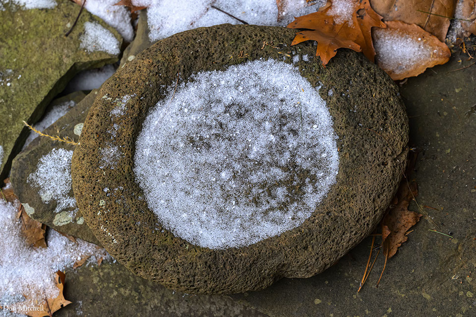 Hawaiian salt evaporation stone filled with snow.